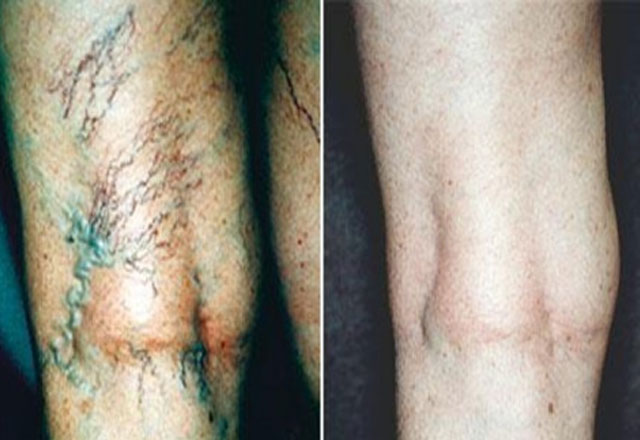 For the smaller veins (sometimes called spider veins, telangectasias or telangs): your cosmetic dermatologist can treat them with sclerotherapy or laser leg vein treatment. Small blue veins (usually less than a half centimeter) can sometimes be treated as well, usually with sclerotherapy. Sclerotherapy is injections of a gentle solution using an acupuncture-sized needle into the blood vessels. This irritates the inside of the vessel and causes them to shrink and slowly disappear. Laser treatments use a powerful, focused light beam to heat the inside of the vessel for a similar effect. With either spider vein treatment, you’ll need one to three sessions and then maintenance every one to three years.